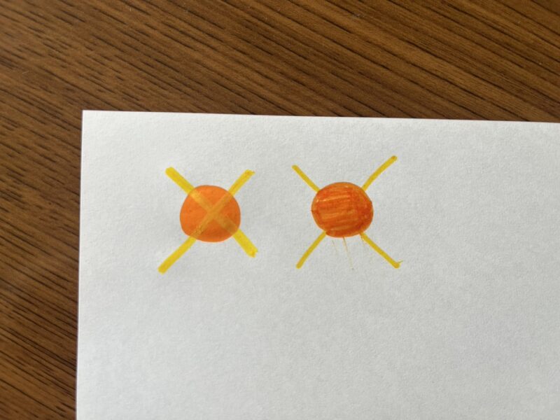 オレンジが乾いたあとに黄色で✕印をつけてみました。