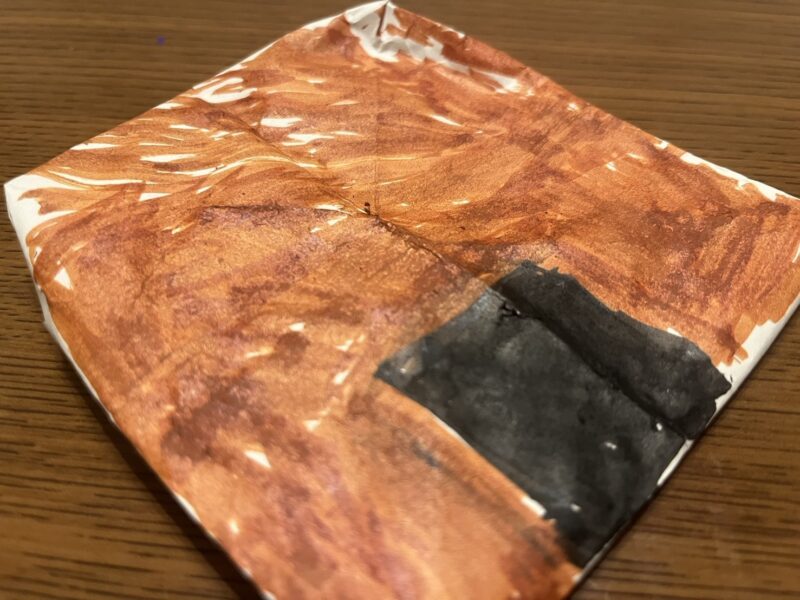 プロッキーで重ね塗りし、真ん中の紙がポロポロしている